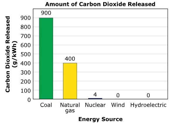 Many different energy sources are used to produce electricity. The Amount of Carbon Dioxide Released graph shows the amount of carbon dioxide gas released by some energy sources, in grams per kilowatt hour (g/kWh).